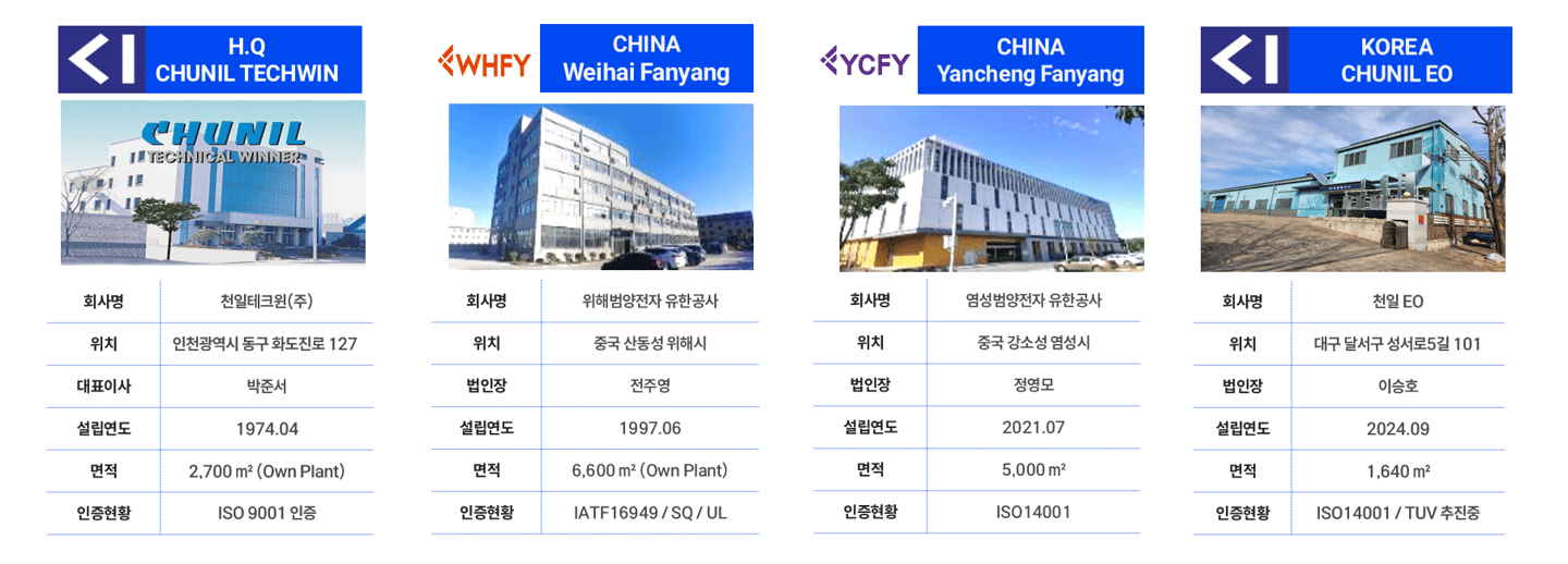 천일테크윈은 한국과 중국에 전략적으로 배치된 4개의 생산 거점을 운영하며, 각 지역 시장의 수요에 신속하게 대응하고 있습니다. 최적화된 생산 체계와 효율적인 물류 시스템을 통해 고객사에게 안정적인 공급을 제공합니다.