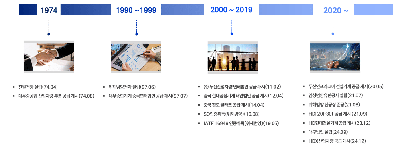 천일 테크윈은 1974년 전장 부품 제조를 시작으로 출발했습니다. 초기에는 자동차 산업을 중심으로 한 전장 및 하네스 부품을 생산하며 기술과 현장 경험을 축적해 왔고, 이후 산업용 장비와 건설기계 분야로 적용 범위를 넓혀왔습니다. 변화하는 산업 환경 속에서도 고객 요구에 맞춘 안정적인 품질과 납기를 기반으로 꾸준히 성장해 왔습니다.